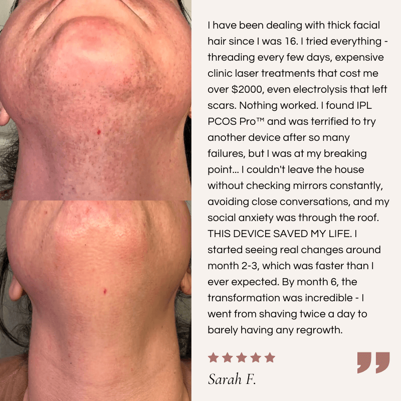 Unlike generic IPL devices designed for fine hair, our device delivers higher intensity light pulses specifically targeting the melanin in coarse, dark hormonal hair that's common with PCOS hirsutism.